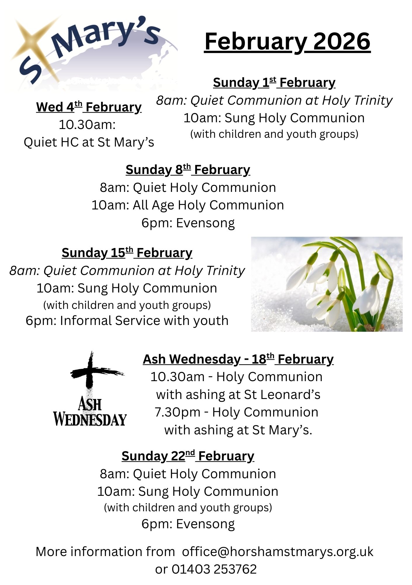 If you would like to be added to the mailing list to receive updates from the St Mary’s team, please get in touch with the Parish Office (office@horshamstmarys.org.uk) to provide your details. If you don’t have access to email please call the Parish Office on 01403 253762 to let us know the best way that we can stay in touch with you.