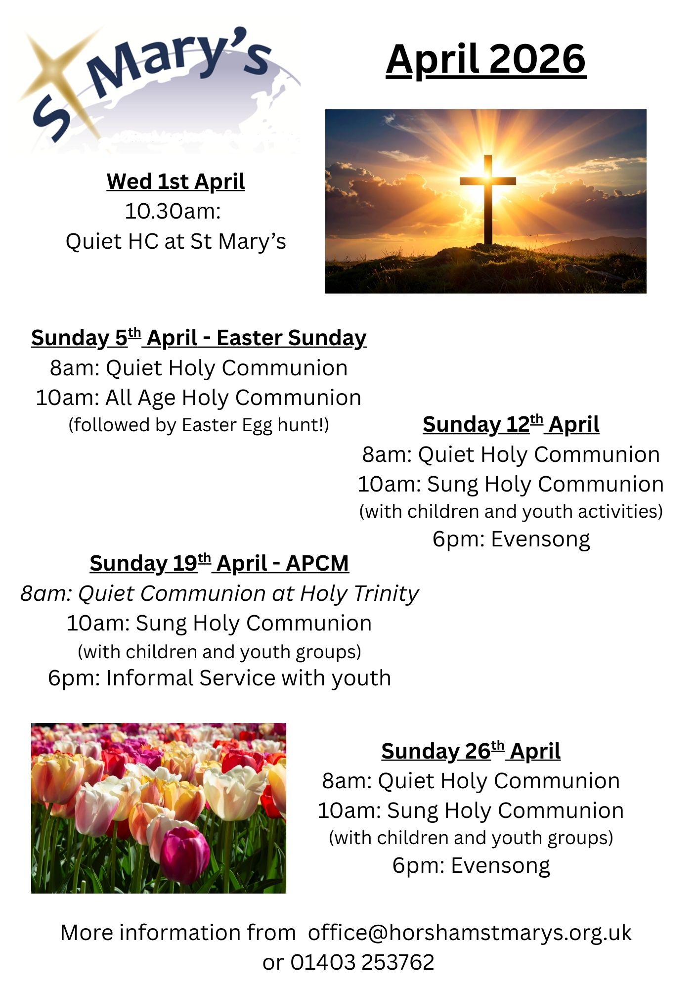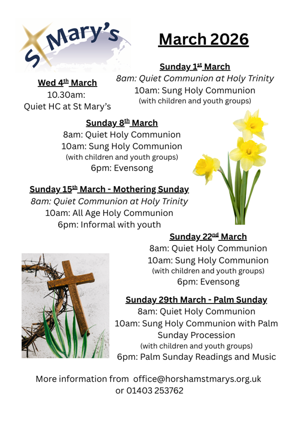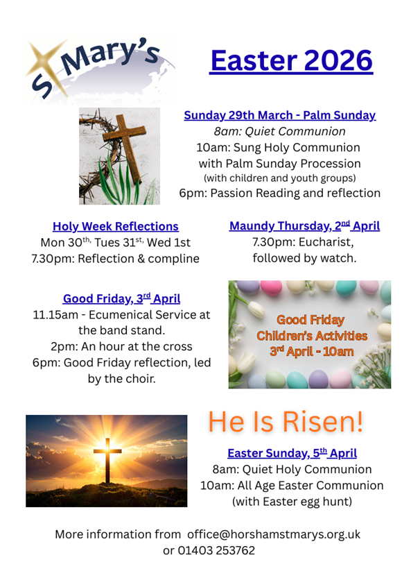 If you would like to be added to the mailing list to receive updates from the St Mary’s team, please get in touch with the Parish Office (office@horshamstmarys.org.uk) to provide your details. If you don’t have access to email please call the Parish Office on 01403 253762 to let us know the best way that we can stay in touch with you.