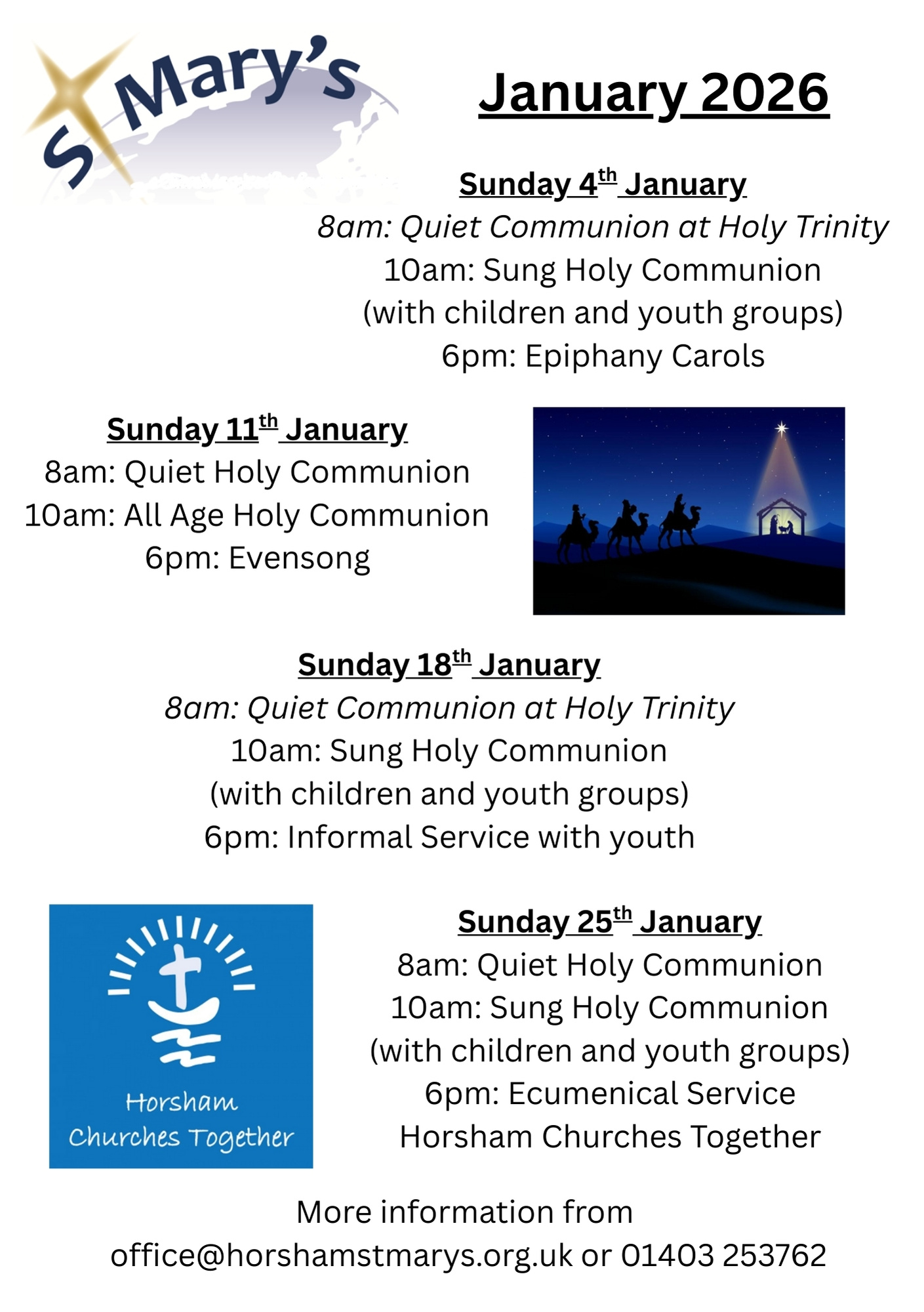 If you would like to be added to the mailing list to receive updates from the St Mary’s team, please get in touch with the Parish Office (office@horshamstmarys.org.uk) to provide your details. If you don’t have access to email please call the Parish Office on 01403 253762 to let us know the best way that we can stay in touch with you.